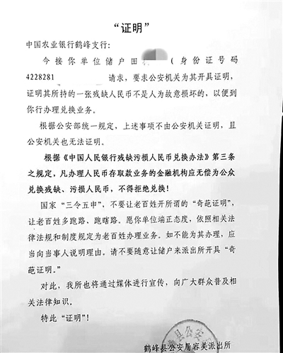 北青報記者看到,一份落款時間為2017年2月3日,蓋有鶴峰縣公安局容美派出所紅色公章的“證明”文件顯示,中國農(nóng)業(yè)銀行鶴峰支行的儲戶田某林被要求公安機關(guān)為其開具證明,證明其所持一張殘缺人民幣“不是人為故意損壞”,以便到該行辦理兌換業(yè)務(wù)。