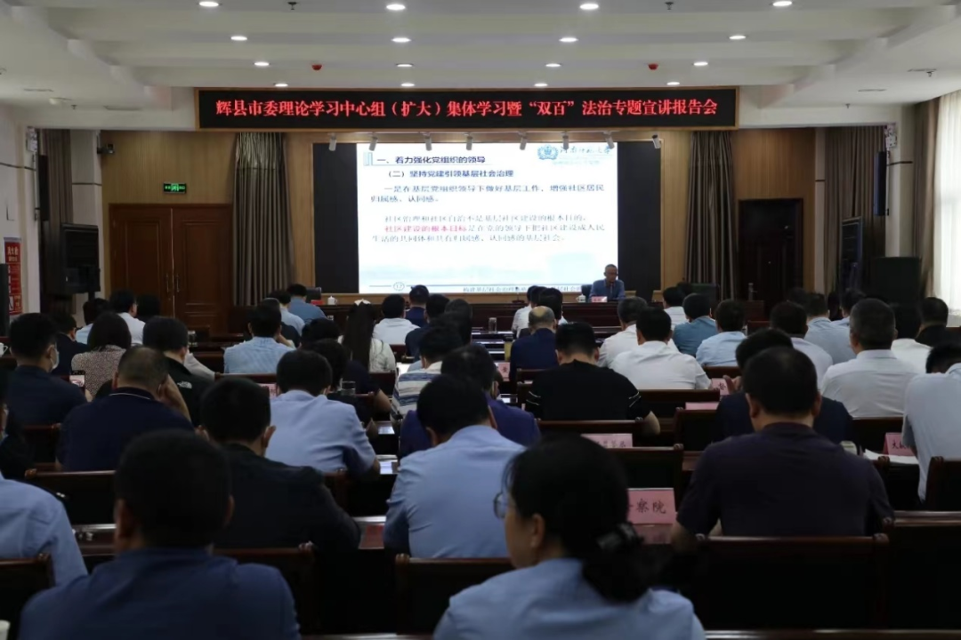 5月23日,輝縣市舉行市委理論學習中心組(擴大)集體學習暨“雙百”法治專題宣講報告會。市四大班子領導,市委有關部委辦局、市直相關單位、各鄉(xiāng)鎮(zhèn)(街道)主要負責同志等120余人參加。市委常委、副書記林慶立主持會議。
